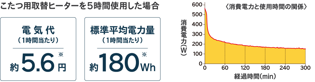 ※電気代及び標準平均消費電力量は、室温20℃で厚さ約5cmの綿のふとんを使用し、人が入らない状態で5時間運転した時の1時間あたりの平均値です。